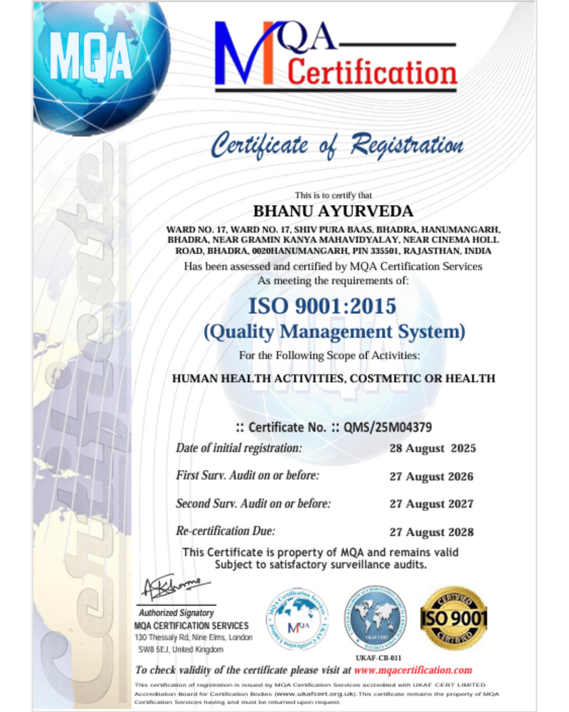 Has been assessed and certified by MQA Certification Services As meeting the requirements of: ISO 9001:2015(Quality Management System) For the Following Scope of Activities: HUMAN HEALTH ACTIVITIES, COSTMETIC OR HEALTH